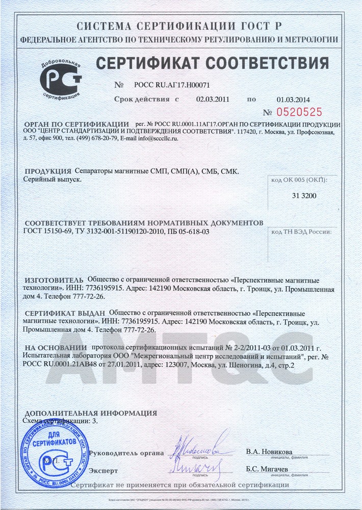 Сертификат соответствия №C-RU.АГ37.В.41074 на сепараторы магнитные с маркировкой СМП, СМПА, СМБ, СМК. Серийный выпуск