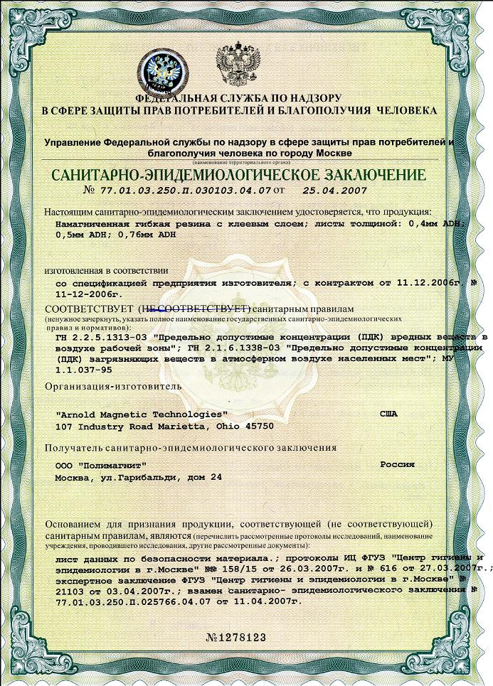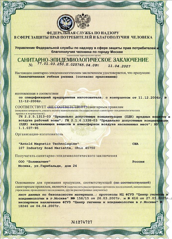 Санитарно-эпидемиологическое заключение о соответствии государственным санитарно-эпидемиологическим правилам и нормативам намагниченной гибкой резины с клеевым слоем