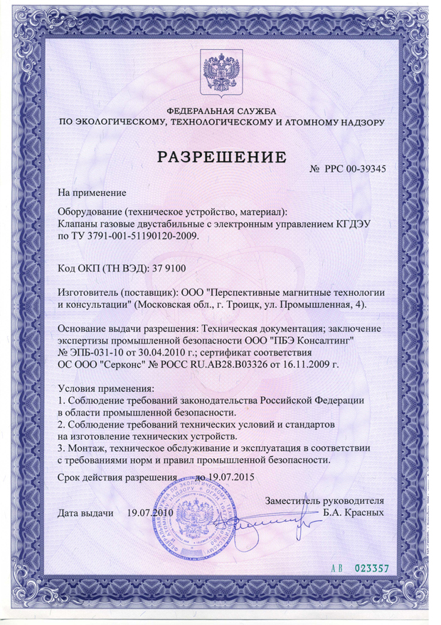 Разрешение Ростехнадзора РФ на применение газового клапана КГДЭУ